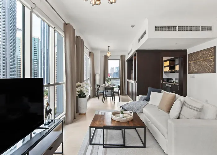 Apartmentul spațios Stunning 1-Bedroom Apartment With Full Burj Khalifa View - 5-Min Walk To Dubai Mall cu 1 dormitoare este situat la 17 minute de mers pe jos de Dubai Mall și oferă o piscină acoperită. Oaspeții pot beneficia de o saună, în timp ce se află la câteva momente de Bastakia Quarter.